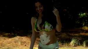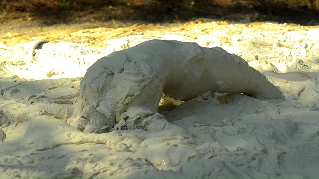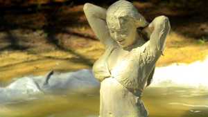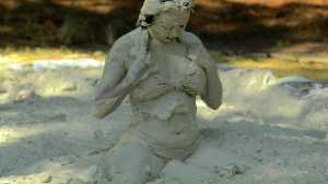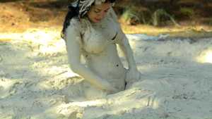 This video involves the beautiful Brazilian model, Maria, taking a dip in a pool of yellow clay. The mud is incredibly thick so every movement is a struggle, but Maria manages to give herself a thick coating regarless. She writhes around in the clay playfully rubbing her body. Maria even lays back and buries her head under the mud twice!