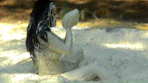 The video cuts to Maria in a pool of water to wash herself off Her body is covered in goose pimples from the cool water, and she slowly removes the yellow clay from her body. There is stage direction throughout the entirety of this video.