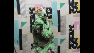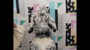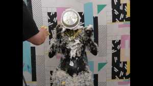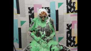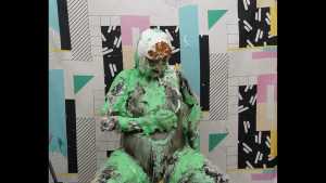 | Olivia stopped by to check out the new studio. She didn't intend on getting messy, but you know how things go. She takes five gooey pies to the face, and gets topped off with a little green slime. Short and sweet!
