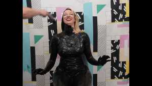 | This is Molly's first time getting messy, and she totally gets into it. She starts off smearing sticky black tar all over her body. The tar looks mesmerizing as the studio lights shine off it, and it drips down the contours of Molly's body.
